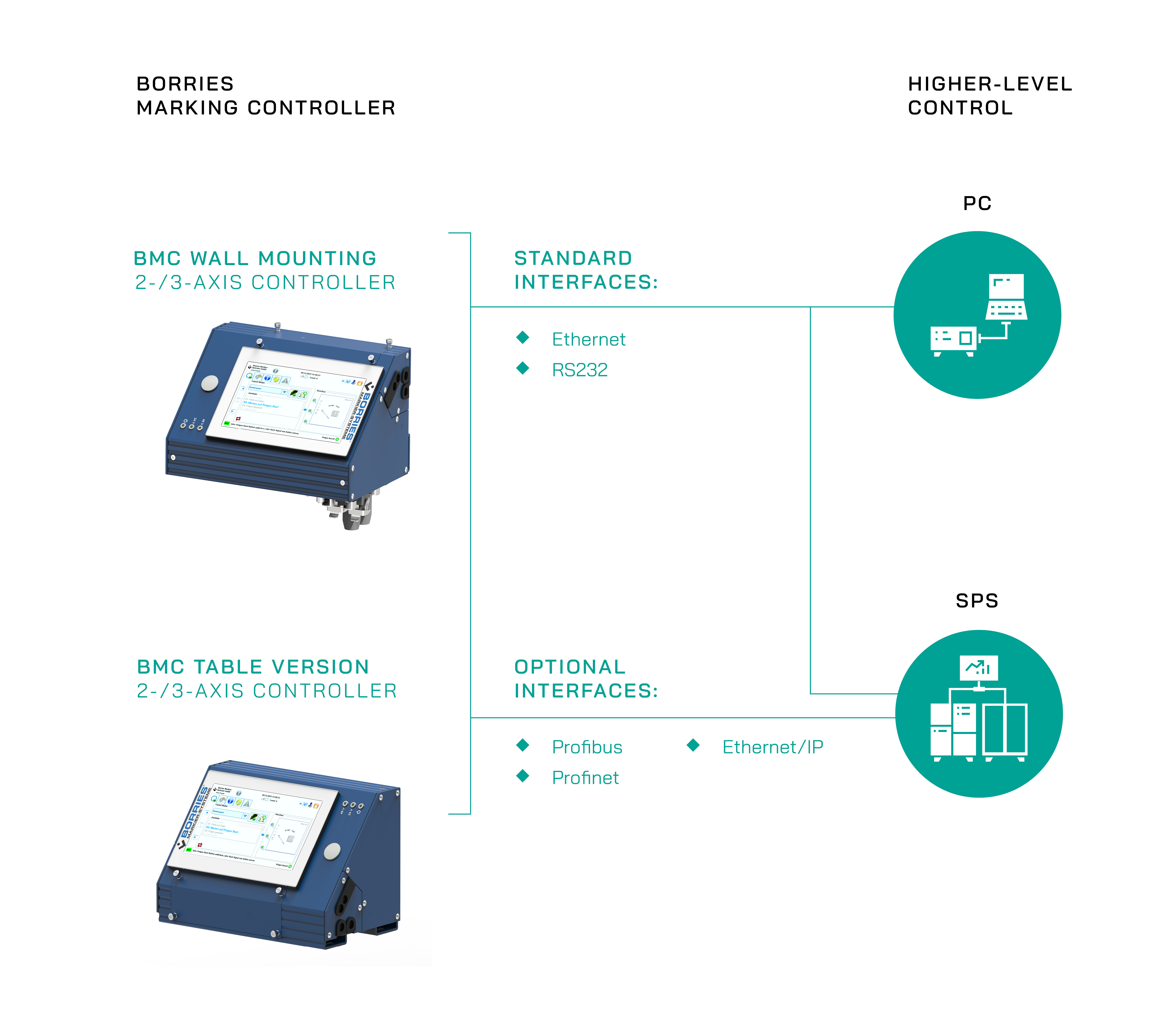 The BMC marking controller is included in the scope of delivery. It can be operated manually or alternatively used for automated workpiece handling. The standalone software also offers connection to higher-level systems using standard interfaces.